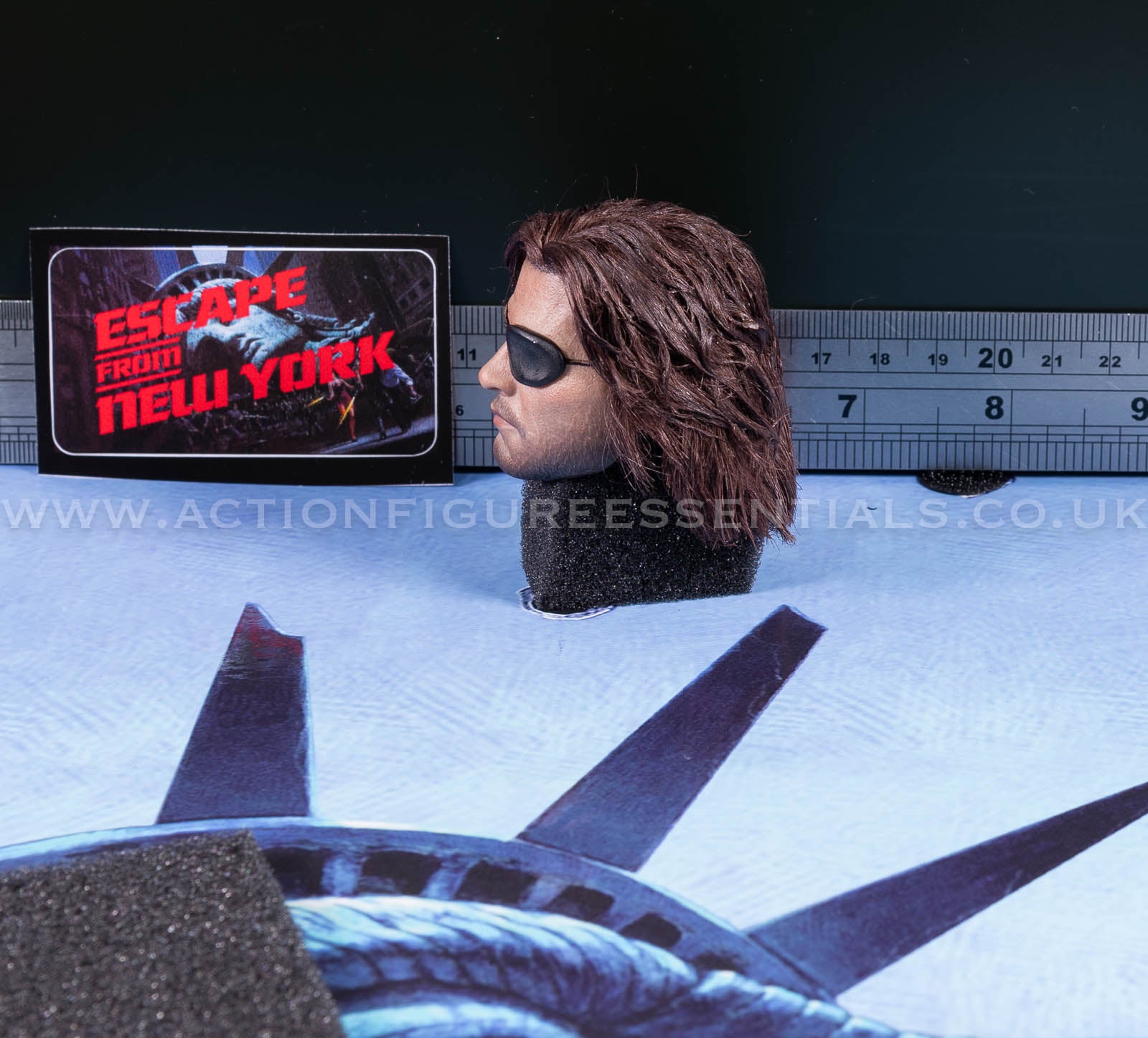 One (1) Realistic head sculpt in super detail and likeness to the movie actor - Kurt Russell as Snake Plissken, with hand glued real wool hair and moveable eyeball (hair may require styling to your preference)